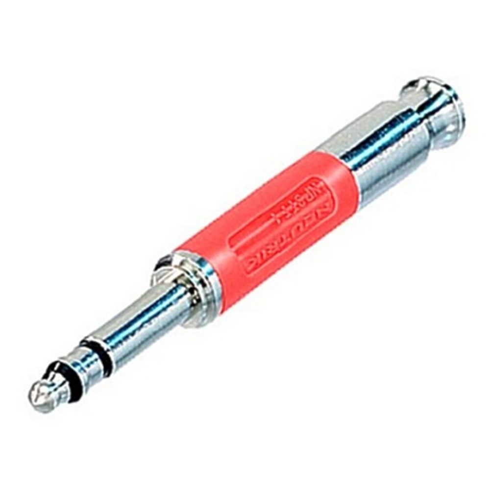 4.4 mm (0.173") tiny telefone plug bantam type, solder termination for T+ R, crimp termination for S, HEX crimp cable strain relief, red plastic housing, nickel contacts. Ideal use with TT patch panels.