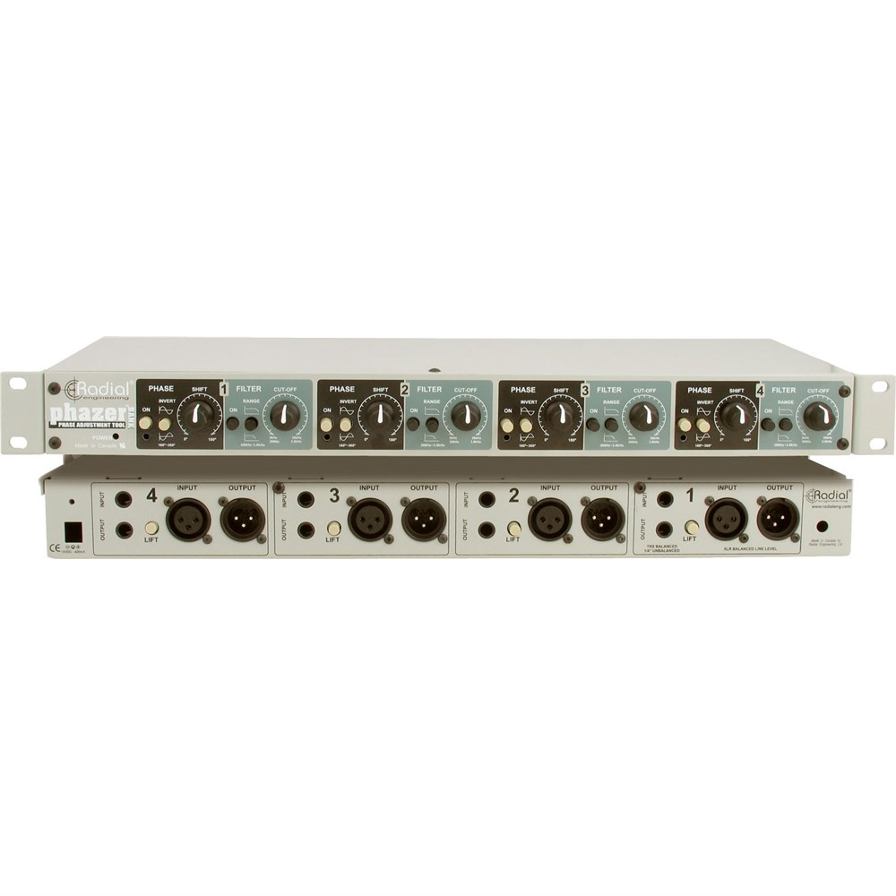The Radial Phazerbank is a 4-channel analogue phase adjustment tool that enables the engineer to effortlessly adjust the phase between two microphones when double mic'ing a single source. Once applied, the result is fatter sounding guitars, a more solid bass, tighter kick and more realistic sounding piano.