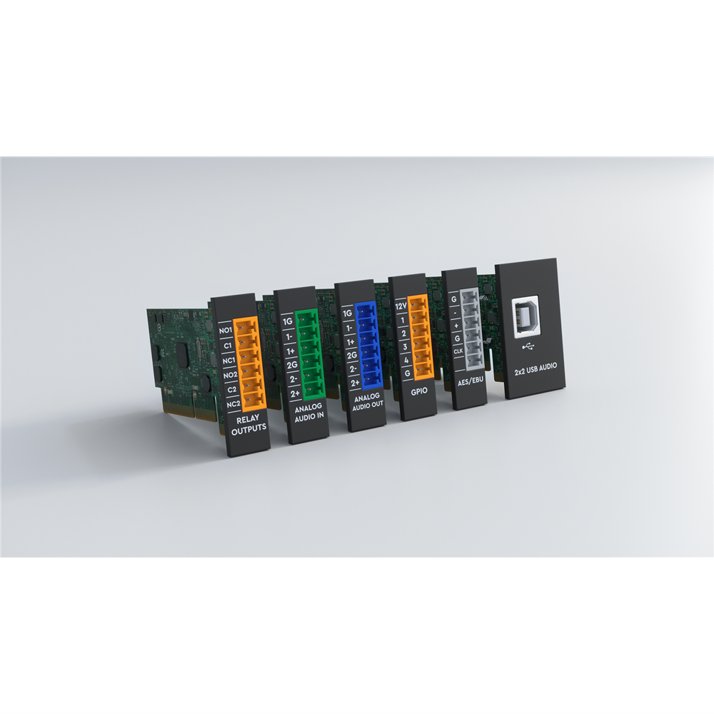 Solaro XC-SGP is a four-channel general-purpose input/output (GPIO) card for Solaro Series processors. The XC-SGP offers the ability to command third-party products and peripherals that are non-networked through both logic or voltage. It is software-selectable for either input or output functionality.