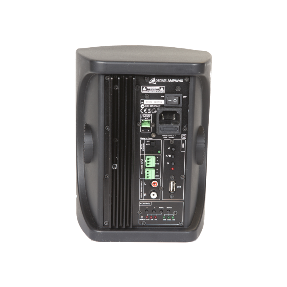 The AMPAV40 features an unbalanced stereo input together with a full balanced stereo line input. An IR remote control is supplied to access all features including full USB/MP3 playback. The standby switch allows the system to engage the auto standby function. In auto mode, the speaker enters into standby (sleep) mode if no audio signal is detected for approximately 3 minutes. The speaker will then turn on automatically when it detects an audio signal.