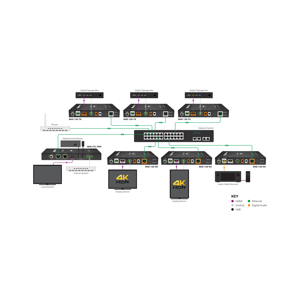 • Both HDMI and Analog outputs allow discrete audio routing from any available NHD-120-TX on the same network.