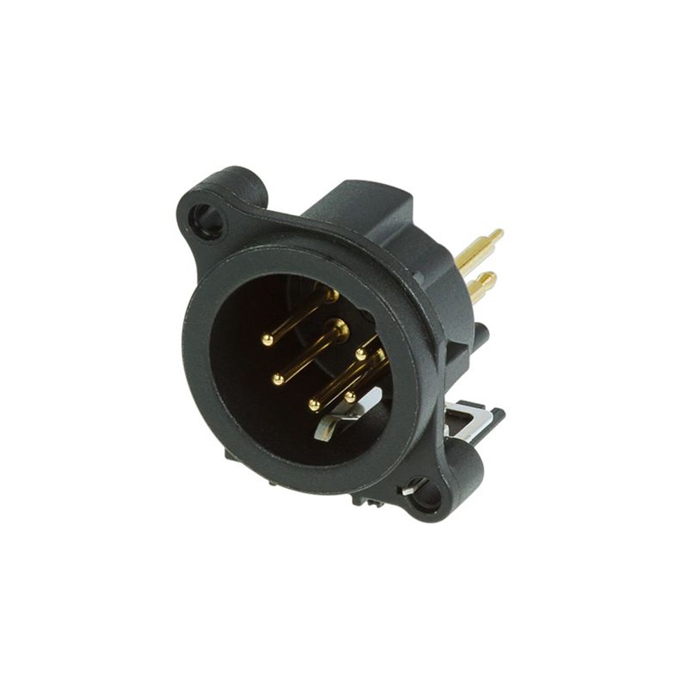 5 pole male XLR receptacle, grounding: separate ground contact to mating connector shell and front panel, vertical PCB mount