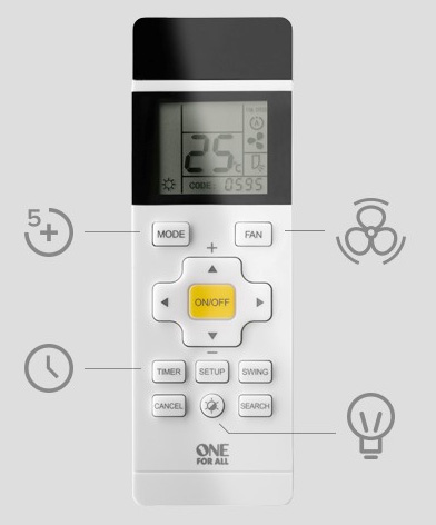 The One For All Aircon remote is the perfect solution to replace your broken or lost Air-conditioner remote. This remote features include full Mode operation (5 options), fan speed adjustability and a timer function.