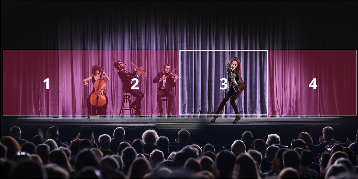 Hybrid ModeFree your performers by enabling unrestricted movement with Hybrid Mode. Use preset areas for zone tracking, letting the camera seamlessly switch to a full view of each pre-defined location as performers move through the areas. If they move beyond these zones, the camera seamlessly adapts, switching to presenter mode to effortlessly and precisely track their movements.