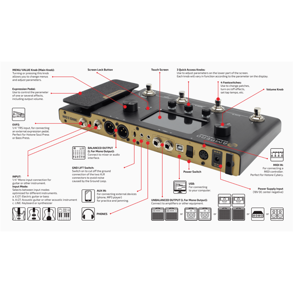 Ampero amp modeler & effects processor is a game changer. Its heart pounding amp modeling and uber quality effects are powered by the new-gen CDCM HD (Comprehensive Dynamic Circuit Modeling High Definition) and F.I.R.E. (Field Impulse Response Enhancement) system, bringing you the absolute best the world has to offer. Packaged in a cool, thin case with a 4-inch hi-def color touch screen, Ampero delivers all the real sounds of rock past and present.