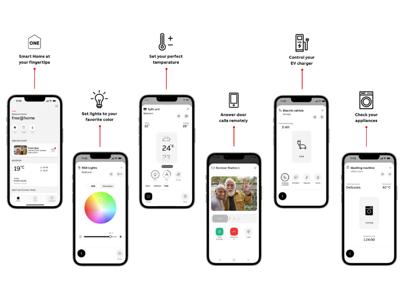 All in one to make your home smarter The freedom to interact the way you want, via touch or voice control, ABB-free@home® gives you the freedom to choose what suits your needs. To live your life your way. Creating the perfect indoor climate or ideal illumination can be done via flexible and precise local or remote controls, with the touch of a finger or voice commands. As it is more natural for you. Cutting-edge touch panels, designed to centralize and simplify the control of your home environment. These multi-award-winning intuitive interfaces can be customized to meet your unique preferences, providing seamless integration of all the functions in your home. ONE APP, MANY APPLICATIONS Control all your smart home devices and answer your door, together on just one App. The ABB-free@home® Next App is available both for iOS and Android, with a redesigned UI to improve your experience. It allows you to use your smart phone or tablet to control lights, blinds, clima, receive door entry calls, manage your smart locks, charge your electrical vehicle, manage home appliances and much more, locally and remotely. Thanks to MyBuildings portal, the remote connection is totally automated and managed with the highest level of security and data privacy. No special settings need to be made on the internet router. ABB FREE@HOME® - MAKING HOME AUTOMATION EASIER THAN EVER Step into the future of smart living with ABB-free@home®. From lighting and climate control to security and energy management, the possibilities are endless. Customize your home exactly the way you want it—easily, efficiently, and intelligently. Whether you're upgrading a single room or automating your entire house, ABB free@home® makes your vision a reality. discover ABB - Sustainable Innovation for a Smart Future CONTROL | INTERCOM AND DOOR ENTRY | POWER | ABB i-bus® KNX | KNX course ABB’s advanced Building Automation and Lighting Control Systems bring intelligence and efficiency to residential, commercial, and industrial spaces. The ABB i-bus® KNX system integrates lighting, climate, air quality, and shading into one seamless network, based on the globally recognized KNX standard. With flexible solutions like ABB Door Entry and Access Control, and a focus on energy efficiency and occupant comfort, ABB is leading the way in smart building innovation.