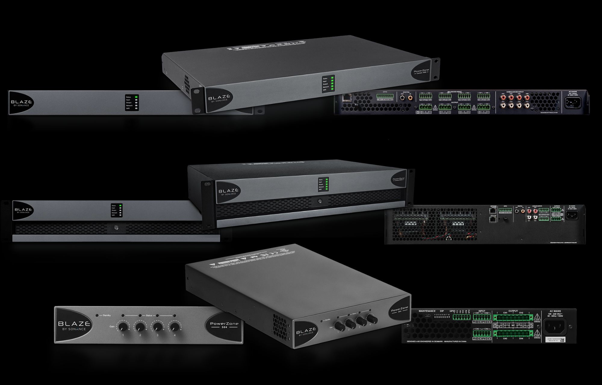 AMPLIFIERS CI series | CBL series | CCA series POWERZONE™ CONNECT 1U SERIES | POWERZONE™ CONNECT 2U SERIES | POWERZONE™ SERIES Blaze by Sonance offers three amplifier series designed to cover every install with power, simplicity, and pro-level performance. The PowerZone™ Connect 1U series delivers compact, DSP-enabled Class-D power with built-in Wi-Fi setup, flexible Lo-Z/Hi-Z operation, and optional Dante™—ideal for small to mid-sized systems. The PowerZone™ Connect 2U series expands this capability with higher output ranging from 1000 W to 6000 W, full-matrix DSP, and Dante-enabled models for large, demanding installations. For projects that don’t require DSP, the PowerZone™ series provides efficient, reliable Class-D amplification in a streamlined form, offering hybrid impedance operation and flexible power sharing. Together, these three series deliver scalable solutions that keep system design simple while ensuring exceptional audio performance across any application.