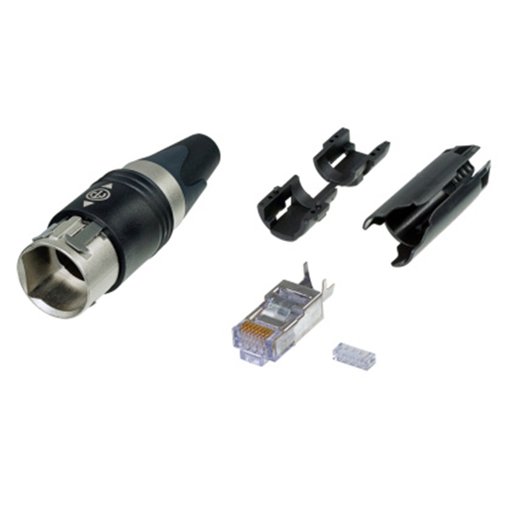 The set NE8MC6-MO includes a cable plug carrier offering a robust metal shell with Push-Pull locking system, proven Neutrik chuck-type strain relief and a CAT6 RJ45 plug. The set can accommodate STP und UTP cables with O.D. of 5.5 to 6.5mm and gauge of AWG 22 to 28 solid or stranded wire. This self-termination version is water-protected according to IP65.