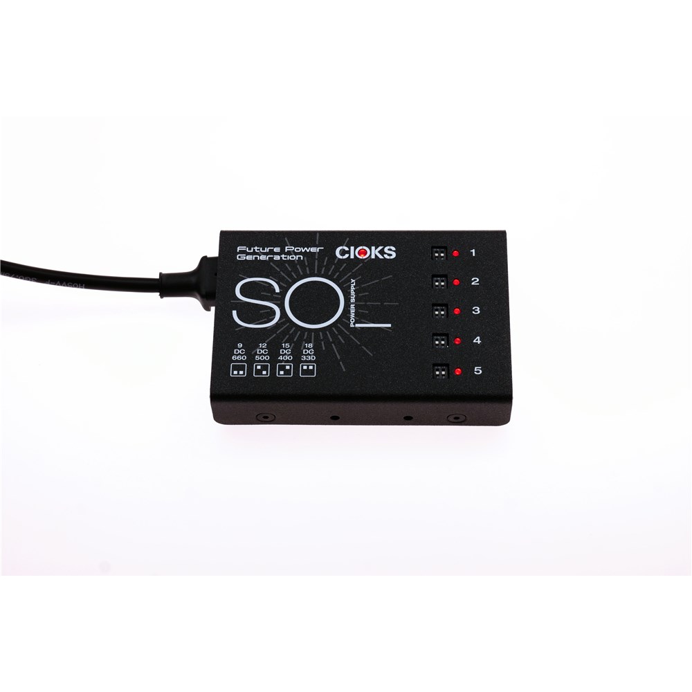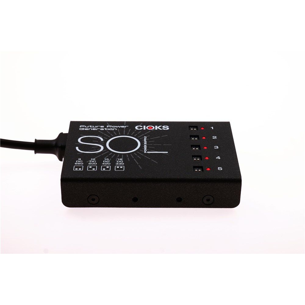 The Heart and SOL of Your Pedalboard SOL is the ultimate solution for bringing life to a small to medium-sized pedalboard setup, especially if you are using power-hungry pedals. SOL is the smallest mains-powered switch-mode power supply we make at CIOKS (no wall-warts here) and the no-frills design plus massive power will leave you free to focus on your creative spark. Featuring the same 660mA at 9V DC per outlet and four switchable voltages on each outlet as its bigger brother CIOKS DC7, SOL is the most powerful small form-factor power supply available today with a total of 30 watts of DC power available.