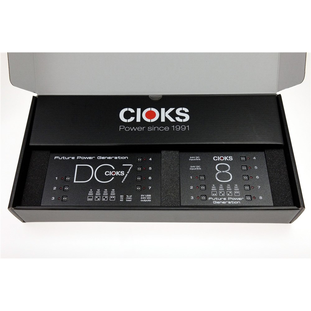When you are building the ultimate pedalboard you need the ultimate in flexible, powerful and reliable power supply and the combination of the CIOKS DC7 and the CIOKS 8 Expander is just what the doctor ordered. With this combo you get fifteen isolated outlets in total with four switchable voltages on each outlet and a USB outlet for your smartphone or tablet via DC7.