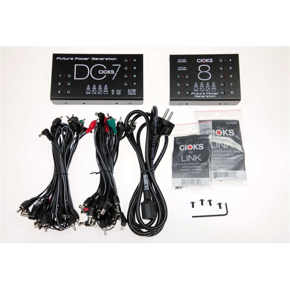 To make the CIOKS Superpower Bundle as future-proof as possible you can expand the number of available outlets for your pedals by purchasing a CIOKS 4 Expander Kit or a separate CIOKS 8 Expander and connecting it to the 24V DC link outlet on the included CIOKS 8.