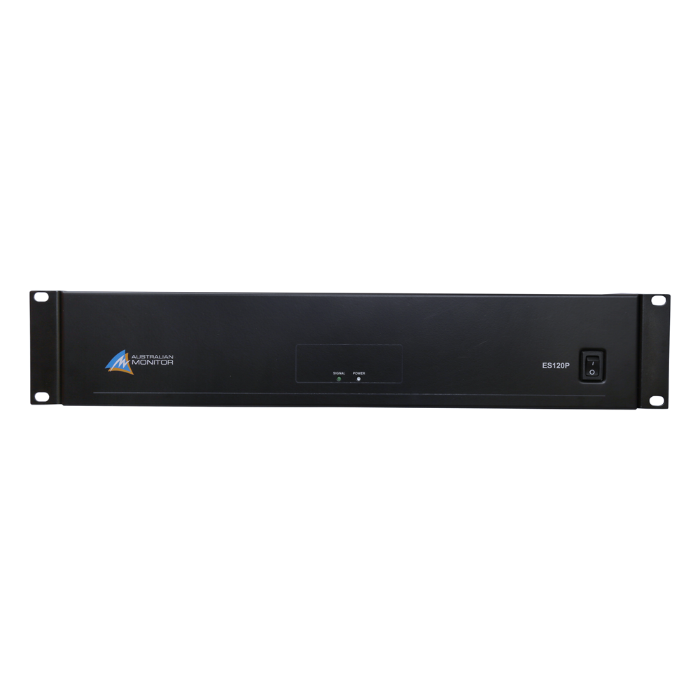 The ES120P power amplifier delivers 120 watts at 100 volt or 4 ohm in a 2 RU package.