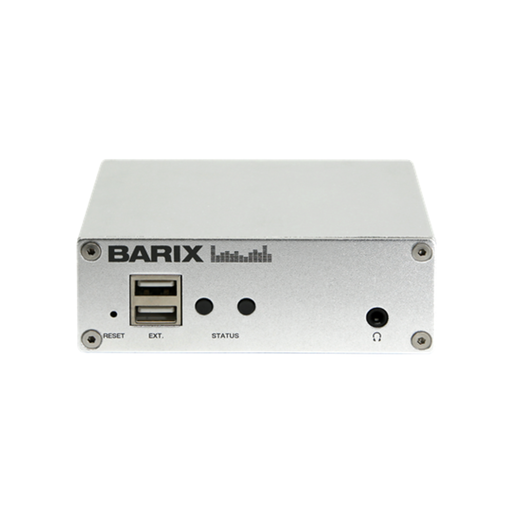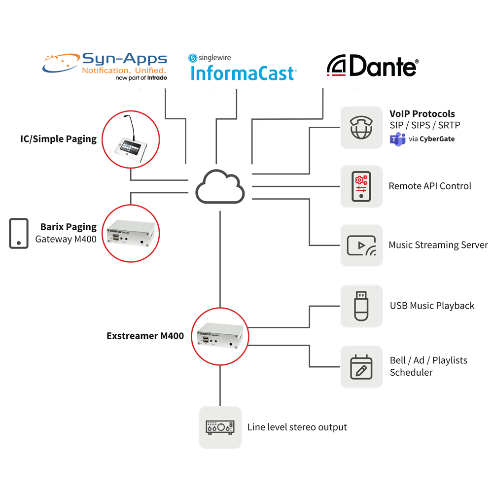 Multiformat IP Audio Decoder with stereo line level audio output on RCA connectorsThe Exstreamer M400 feeds your PA and turns it into an extensive Audio over IP system. A wide variety of audio environments, such as Dante ®, SIP, InformaCast and Syn-Apps are supported. Codecs include PCM, AACplus, MP3, OPUS, G.711, G.722 that can be streamed using HTTP and RTP. Audio files can be stored on the internal memory and their playback can be triggered via a simple UDP command. Thanks to the priority handler, the Exstreamer M400 can be configured to switch between sources according to one of the five priority settings and therefore eliminates the need for an audio matrix device. The M400 is a solid metal device, compact and easily installed. It is connected to your amplifier, DSP or audio mixer via a stereo output on RCA connectors. The configuration of the device is done via the local web interface.