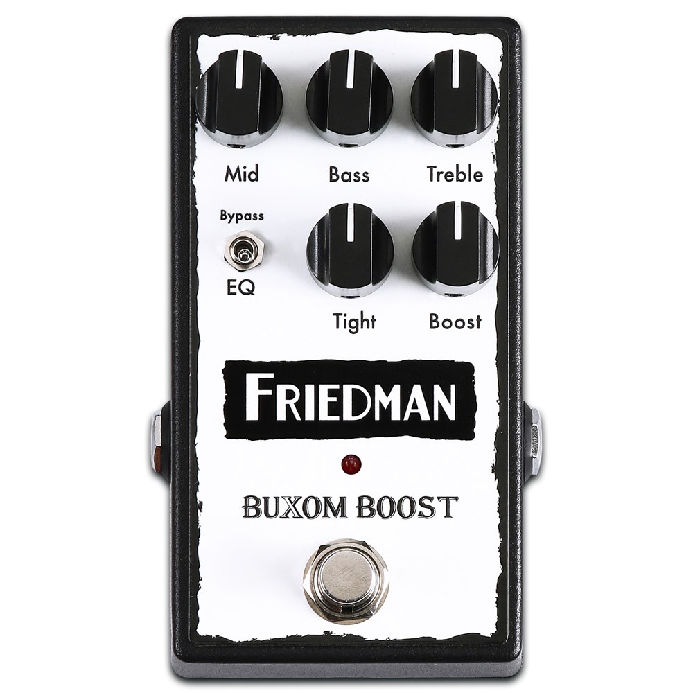 The Friedman Buxom Boost may be the most powerful tonal solution you ever put on your pedalboard. Like its namesake amp head, this pedal pushes a pure, clean signal to conjure the absolute most from your tone. Turning the boost control is your ticket to volume increase, pushing the front of your amp for thick harmonic overdrive, or balancing between two guitars with varying output. Whether you're after a tone tailored by its active mid, treble, and bass controls or the pedal's ability to achieve total transparency - thanks to its onboard EQ Bypass switch - it's all in there. We've even added a useful tight control for reigning in your tube amp's bottom end when boosted. As expected, every Buxom Boost pedal is crafted with the attention to detail and fine ear for tone that comes with Dave Friedman's name.