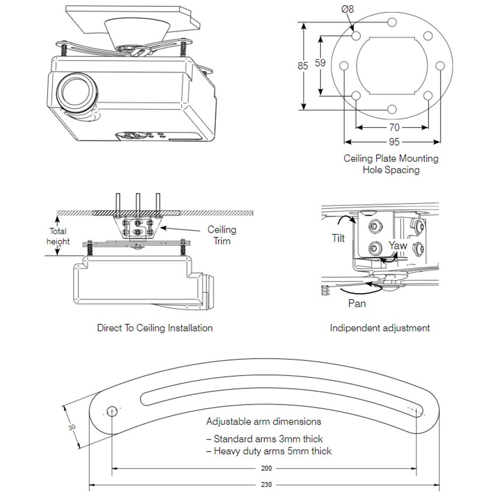 • Stylish adjustable arms to suit most base-mounted projector models. M3, M4, M5 and M6 set screws provided.• Ceiling Trim to cover ceiling cut-out and bolts.• Independently lockable Yaw, Tilt and Pan adjustments.• Standard (3mm thick) Adjustable Arms certified to carry 12 kg maximum.• Heavy Duty (5mm thick) Adjustable Arms certified to carry 25 kg maximum.• Heavy Duty Arms available in Standard and Extra Long lengths. Heavy Duty Standard Arms, 200mm long and Extra Long Arms 300mm length.• Heavy Duty Kits available in White or Black by ordering:– For Standard Arms, LPM4SKYWHD (white) or LPM4SKYBHD (black)– For Extra Long Arms, LPM4SKYWHDXL (white) or LPM4SKYBHDXL (black)