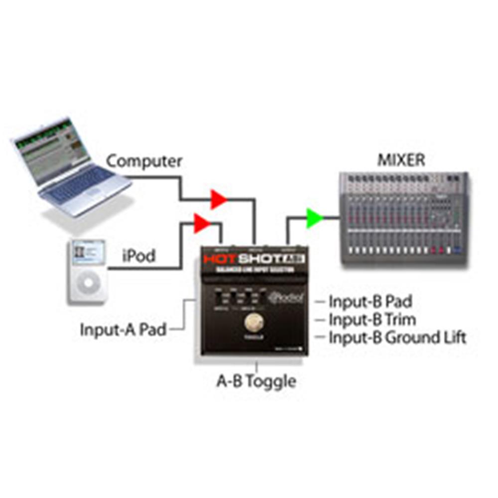 The HotShot ABi makes it easy to select between two balanced inputs on stage, with a single latching footswitch to toggle from one source to the other. This allows an artist to switch between two dynamic microphones during a performance, freeing up input channels on your mixer. The latching footswitch also opens the door for other useful applications, including using the ABi as a mute to turn off a microphone, select between two wireless receivers, or switch between two mono playback devices.