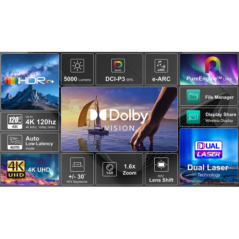 Dual Laser technologyOptoma aims to provide the ultimate visual experience wherever you are. With dual-laser technology, it delivers brighter images and more accurate, richly saturated colours.