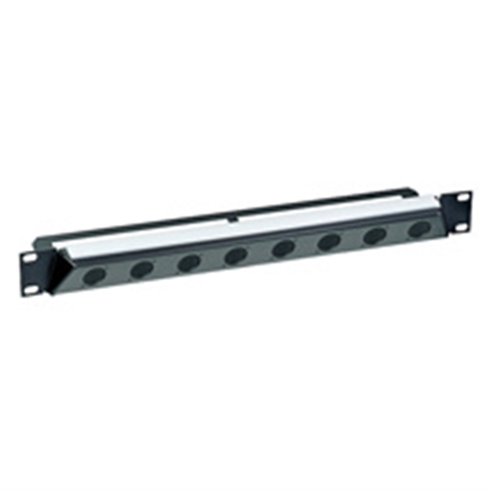 The angled 19" panel for d housing racks in demanding environments protects the installed receptacles well against the ingress of dirt and water. The panel is 30° forward-turned and offers 8 D-shape cutouts with M3 threaded fastening holes.