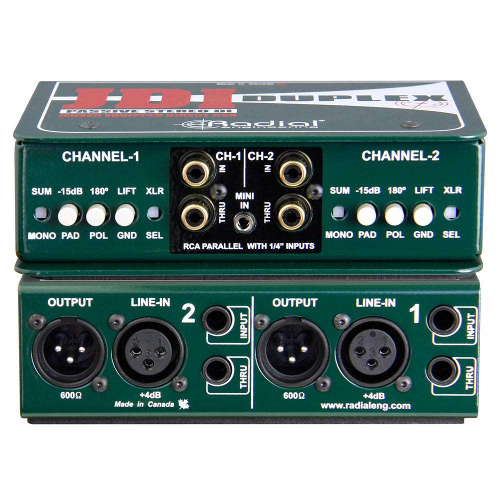 The JDI Duplex takes the exceptional transparency and wide bandwidth of the JDI Stereo passive direct box, and adds numerous connector types and line-level inputs to provide the audio technician with the ability to interface with any stereo sound source. Designed to handle extreme signal levels without distortion, it utilizes two world-class Jensen JT-DB-EPC audio transformers to deliver a smooth, warm sounding Bessel curve - reminiscent of the finest vintage gear. Ruler flat from 10Hz to 40kHz and with virtually zero phase deviation, the JDI Duplex delivers the natural, pure sound of the instrument without artifact. The inputs can be accessed via 1/4", RCA, 3.5mm TRS, or XLR line-level connectors, making it easy to plug in any sound source, from stereo instruments to consumer playback equipment, or professional +4dB line-level audio equipment.