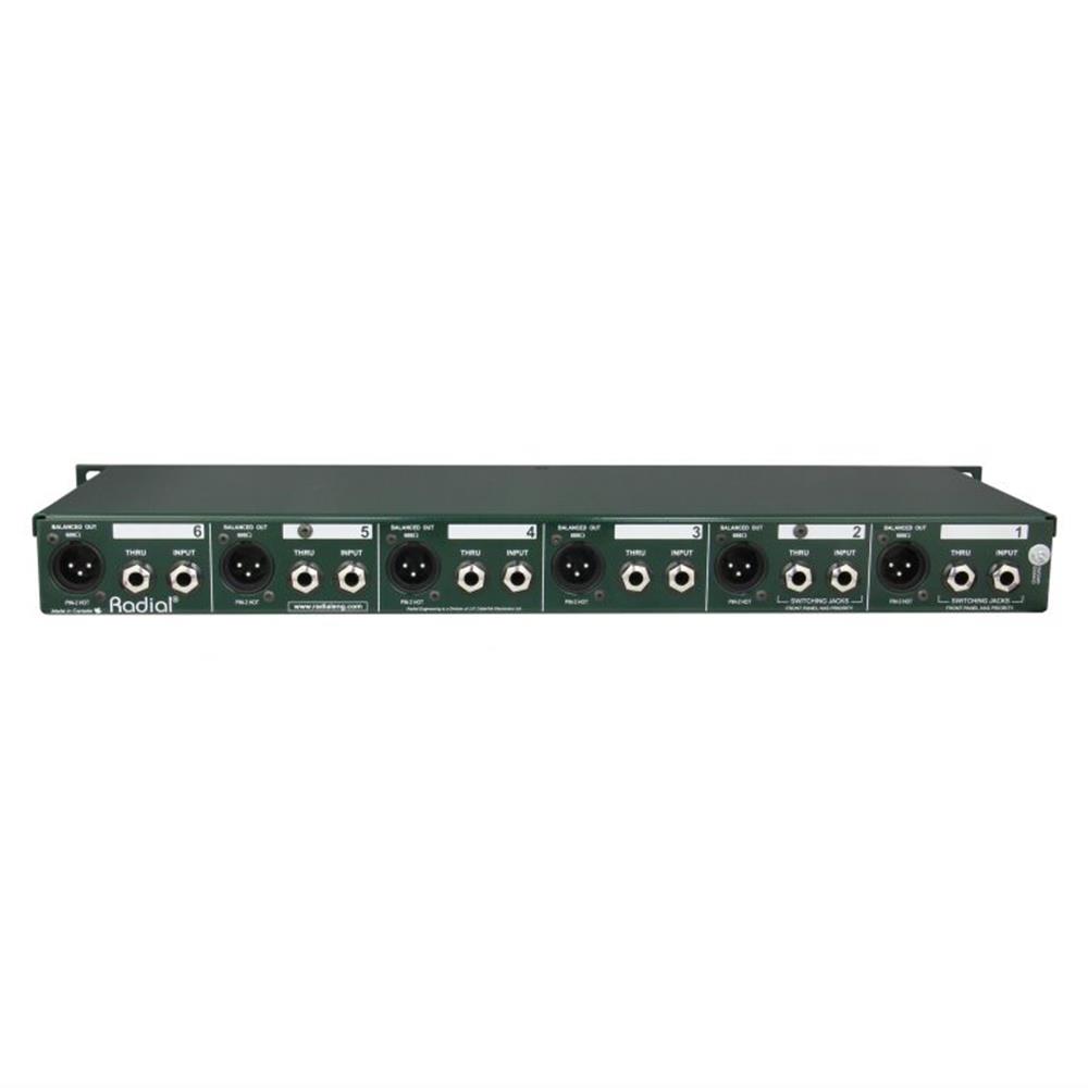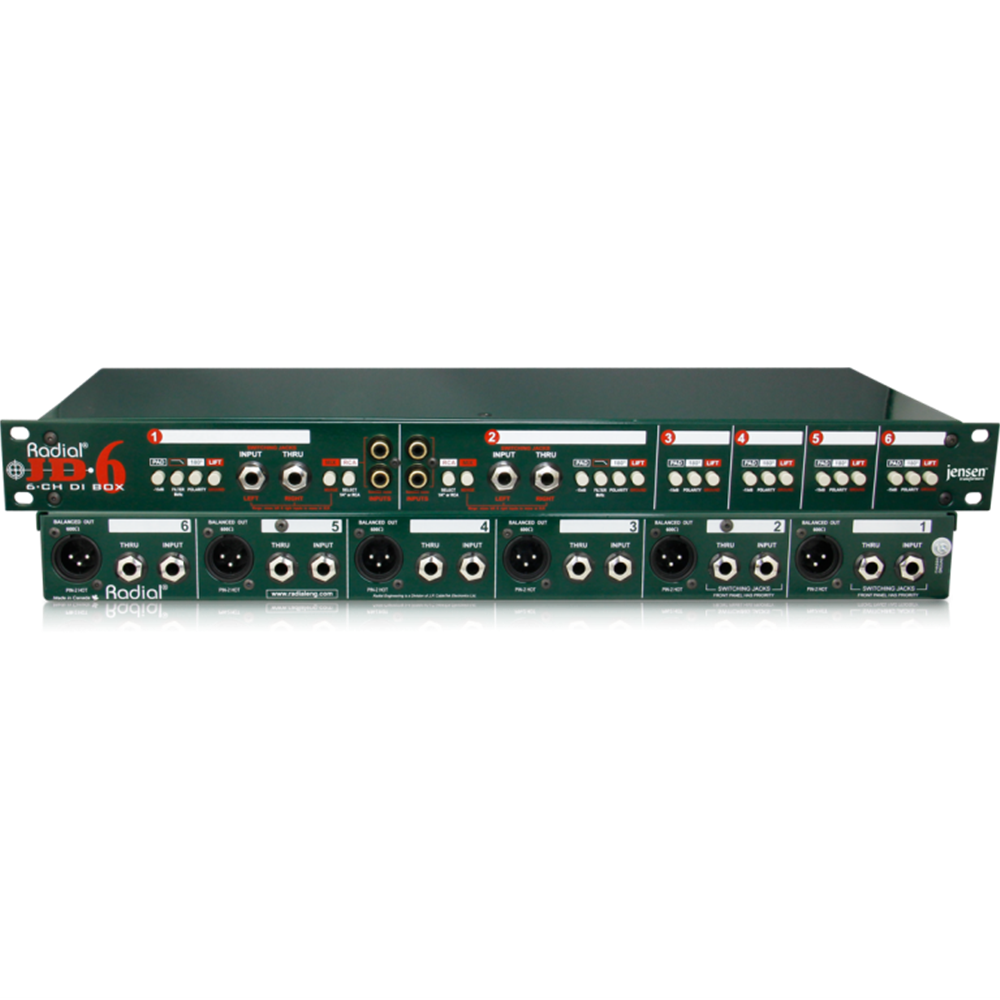 Stemming from the industry standard Radial JDI™, the JD6 incorporates six premium Jensen transformers with extra RF filtering to ensure optimal signal transfer with the minimal noise, phase shift, or distortion. These are also able to withstand extreme signal levels, which makes the JD6 particularly effective when managing high-output active devices such as digital pianos that will often overload most direct boxes or preamps. Each JD6 channel is equipped with a rear-mounted ¼" instrument input and thru-put for the artist's amp plus a balanced XLR output to feed the mixing desk, while Channels 1 and 2 include front panel connectors that switch the input as soon as a cable is inserted for improved efficiency in the studio.