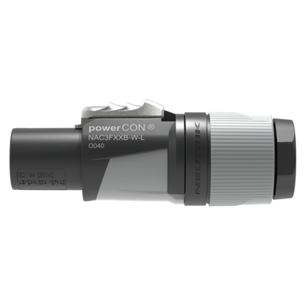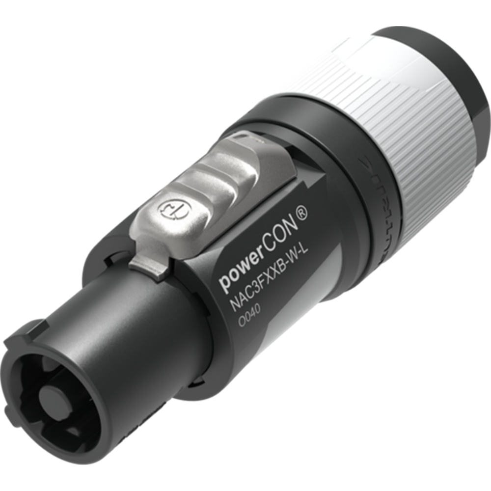 The powerCON FXXA/FXXB is a single phase (3 conductor) lockable power connector with Circuit Breaking Capability when mated with powerCON XX Series receptacles.