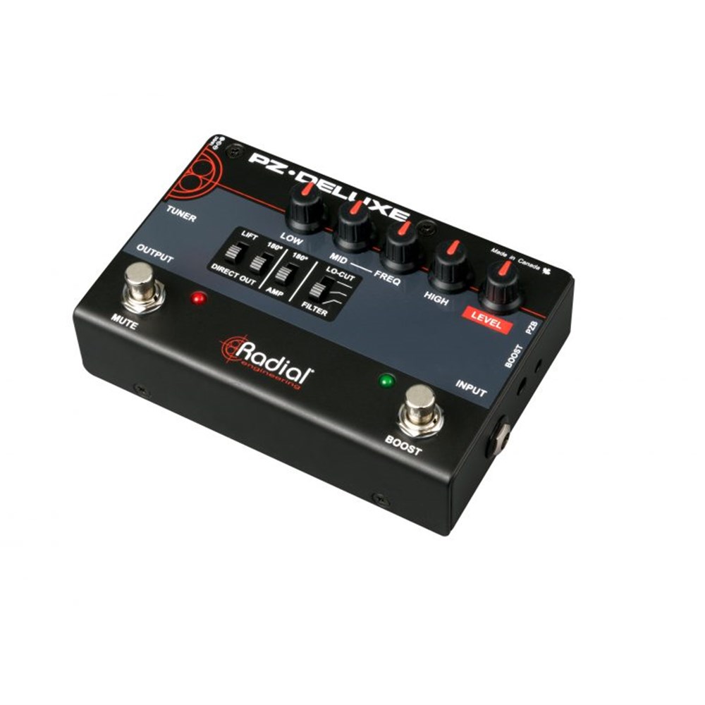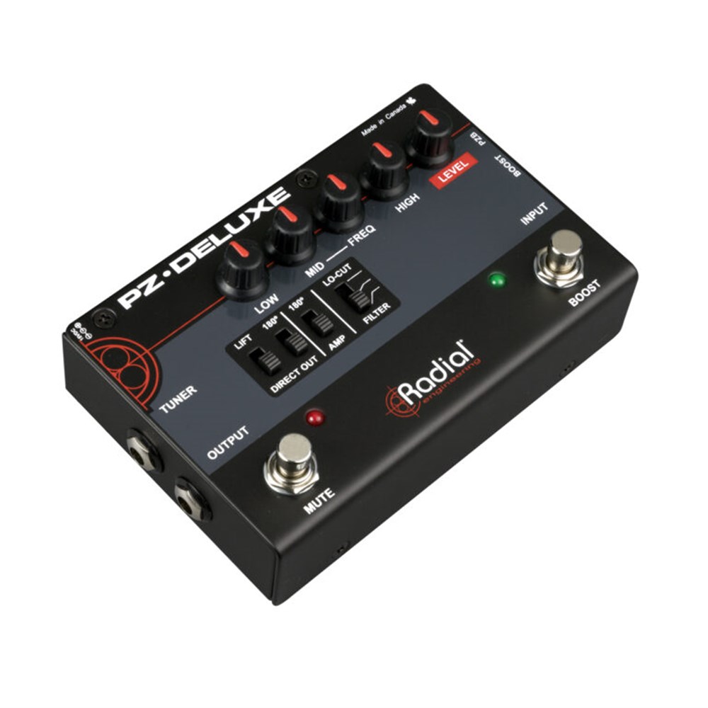 The PZ-Deluxe is an instrument preamp with a low noise front end that is capable of exceptional dynamics to adapt to all instruments including acoustic guitar, upright bass, mandolin and violin no matter what type of pickup system is being used. Powerful EQ controls allow you to shape your tone through the PA and a stage amp, with a low cut filter and 180° polarity reverse switches to help eliminate feedback on stage. A special PZB gain stage can be activated for use with instruments that have piezo transducers, increasing the input impedance to 10 meg ohms to eliminate the squawk and harshness that are sometimes associated with those pickup systems. The PZ-Deluxe also features a high quality Radial DI to provide a balanced output that can drive cables of over 100 meters (300ft) without noise into the PA system, and built-in mute and boost footswitches give you instant control for solos, instrument changeovers, or silent tune-ups on stage.