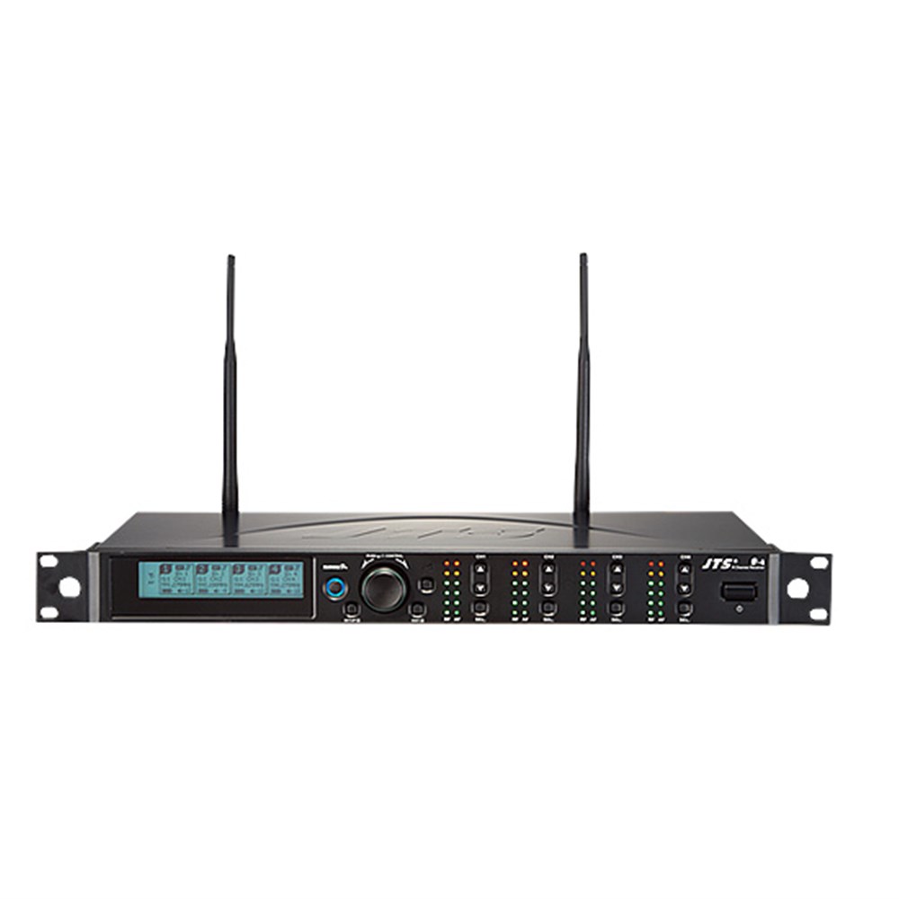 The system is designed with JTS newest generation wireless technology. To cope with the squeezed radio spectrum the system provides more compatible channels within limited bandwidth. The R-4 is a 4 channel system in a 19” one U case. Antenna outputs and AC power supply are designed to be cascaded. It provides great convenience to installation.