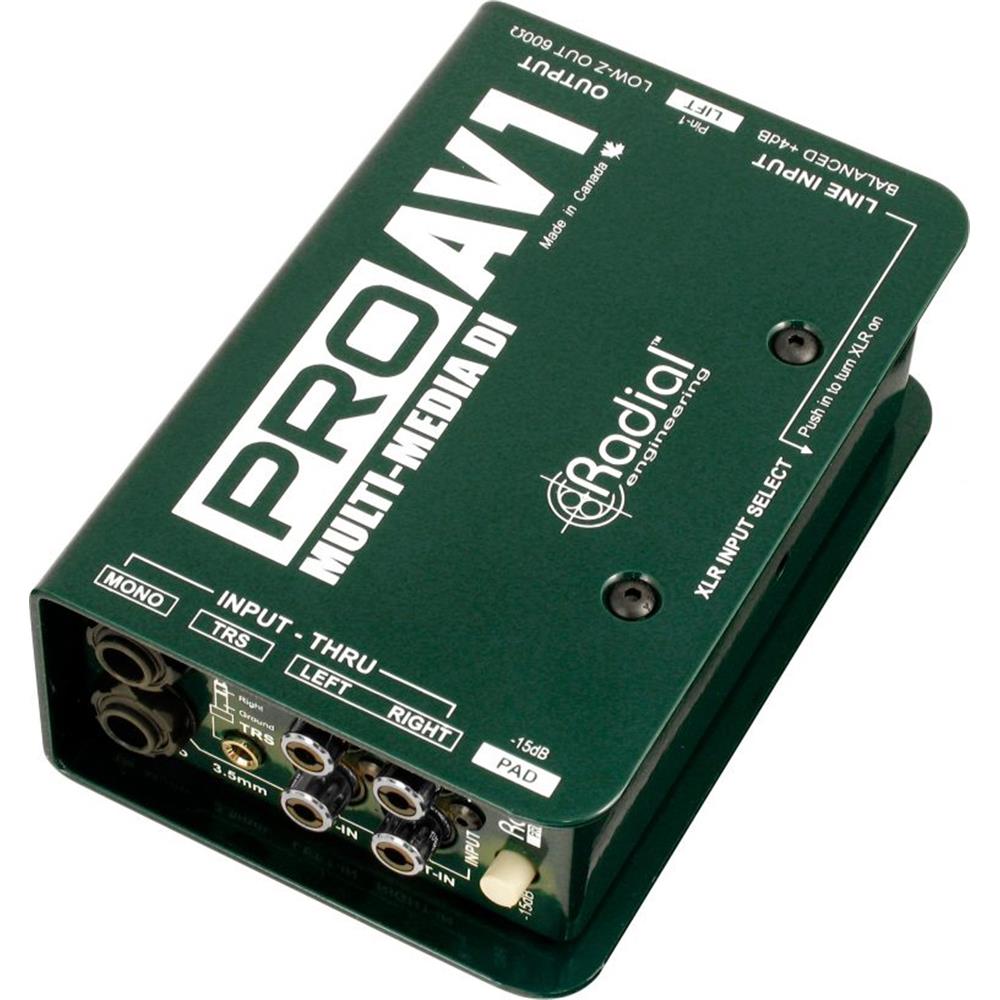 The ProAV1 is a passive direct box with multiple input connector types and a stereo-to-mono merge function designed specifically for AV integrators to reduce channel requirements.