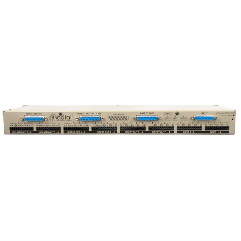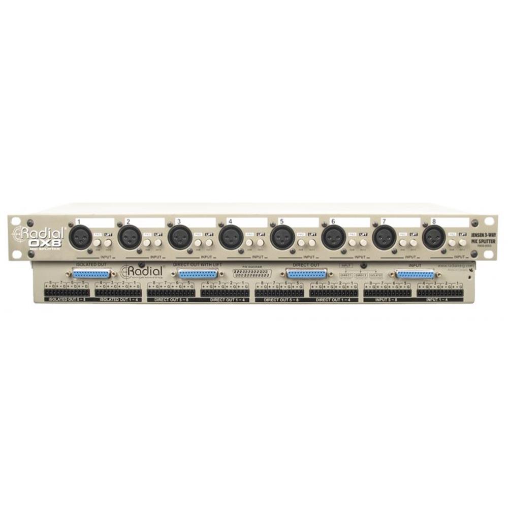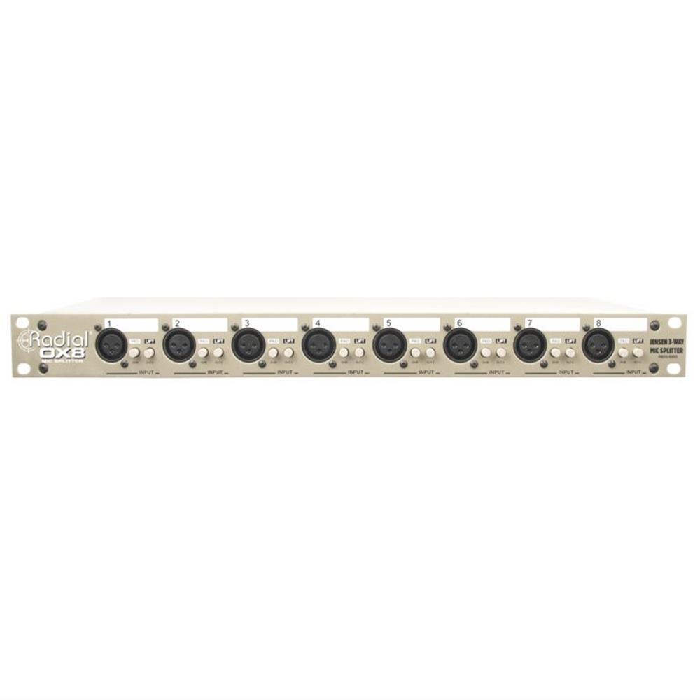 The Radial OX8 is a professional audio tool that is equally at home on a live stage as it is in a broadcast studio, splitting eight microphone signals to multiple destinations simultaneously without noise or distortion, and eliminating hum and buzz from ground loops. Each channel is configured with a balanced input, a direct out which also serves as a return path for 48V phantom power, a thru-put with a ground lift switch, and a fully transformer-isolated output. The OX8 may be ordered with premium Jensen JT-MB-CPC transformers or Eclipse ET-MS10 transformers as an affordable alternative. Each channel also benefits from an ultra-short signal path and built in RF filters to ensure absolute quiet performance even in the most noise-prone environments.