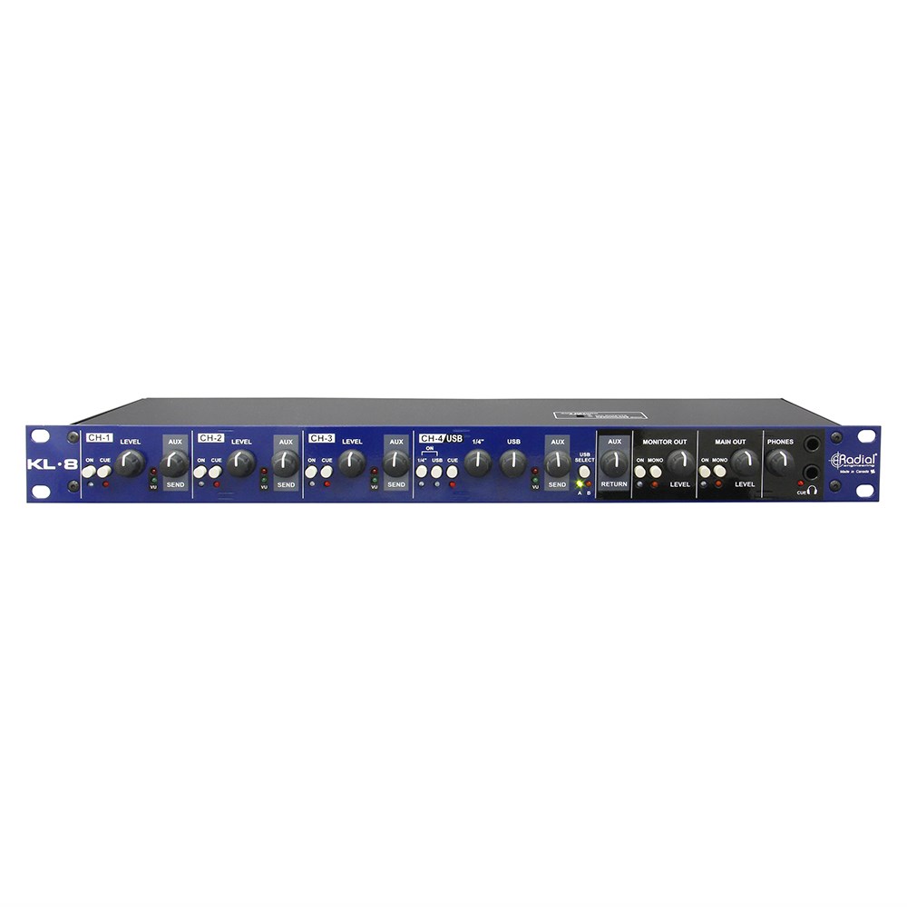 The KL-8 is a powerful mixing station created with keyboard pros in mind, with a number of features designed specifically to streamline and enhance any keyboard setup. You can connect up to four keyboards in mono or stereo, with level controls, aux sends, and LED indicators for each. A stereo aux send/receive is available to feed rackmount reverbs and delays and effects pedals, or it can be used as an additional input for a fifth keyboard. MIDI and USB connections make it easy to control a laptop soft-synth, utilizing high quality 24bit/192kHz digital audio converters. The KL-8 also features multiple output options, with transformer-isolated XLR main outputs to feed the PA, monitor outputs for a set of speakers on stage, and dual headphone outputs for local monitoring and testing.
