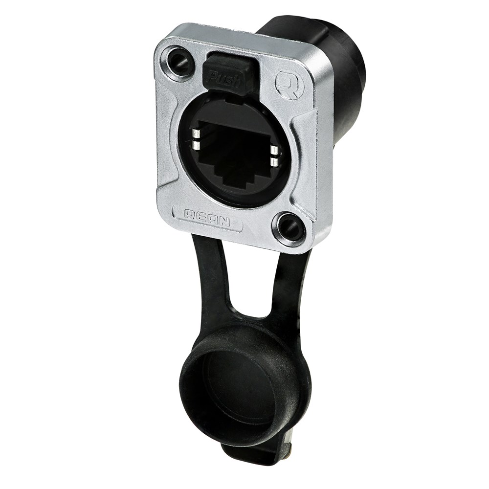 Female RJ45 receptacle with a front-mountable D-Size flange, gold plated contacts and IP65 rating to optimally protect your device or equipment from water ingress.