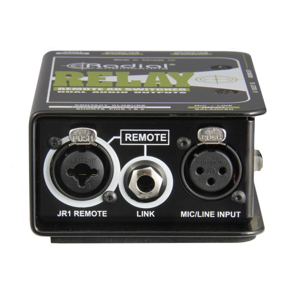 When artists that employ wireless microphones on tour, the receivers are typically located off stage. The remote input on the Relay Xo allows it to be connected next to the wireless receivers to reduce cable clutter, while still providing control to the artist on stage with a remote footswitch. Two versions of the Radial JR1 footswitch are available for use with the Relay Xo; the JR1-M with a momentary switch that will activate output-B as long as the footswitch is held down, and the JR1-L with a latching switch that will hold on the last selected output.