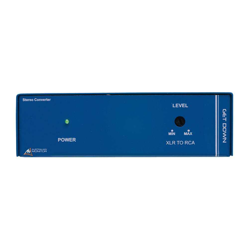 The GET DOWN stereo converter converts a professional line level balanced audio signal to an unbalanced domestic level signal.