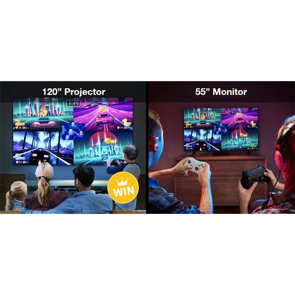 Play big with family and friends. Drastically scale up your gaming experience.Optoma takes gaming to the next level. UHZ45 packs in everything a gamer could want: An immersive large screen image with a rich color gamut, extremely-low input lag, high refresh rates, good motion handling and excellent contrast—perfect for intense gaming as well as casual gaming.