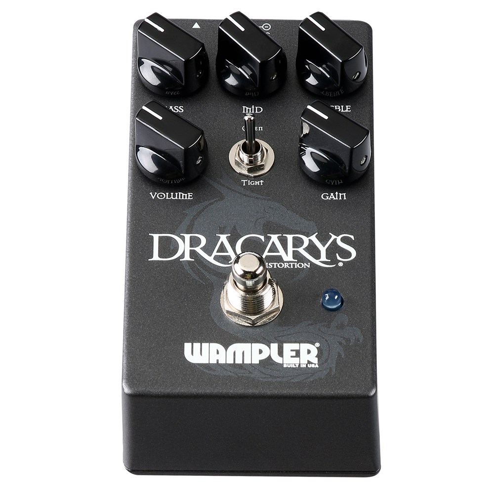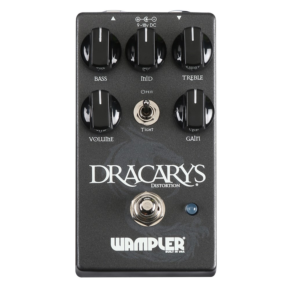 With the now famous Wampler 3 band active EQ to sculpt the tone perfectly, also included is a gain switch giving you two different styles of distortion. Open - is, as you might guess, extremely open and free - minimal compression with maximum tone. Tight brings in a natural compression, like a tube amp being driven to the very edge... the great thing about the tight is that when on a lower gain setting it can do a really good lower gain tone as well, this setting makes the Dracarys one of the most versatile modern distortions available today. There is no waste with this pedal, all tones are useable and easily available.