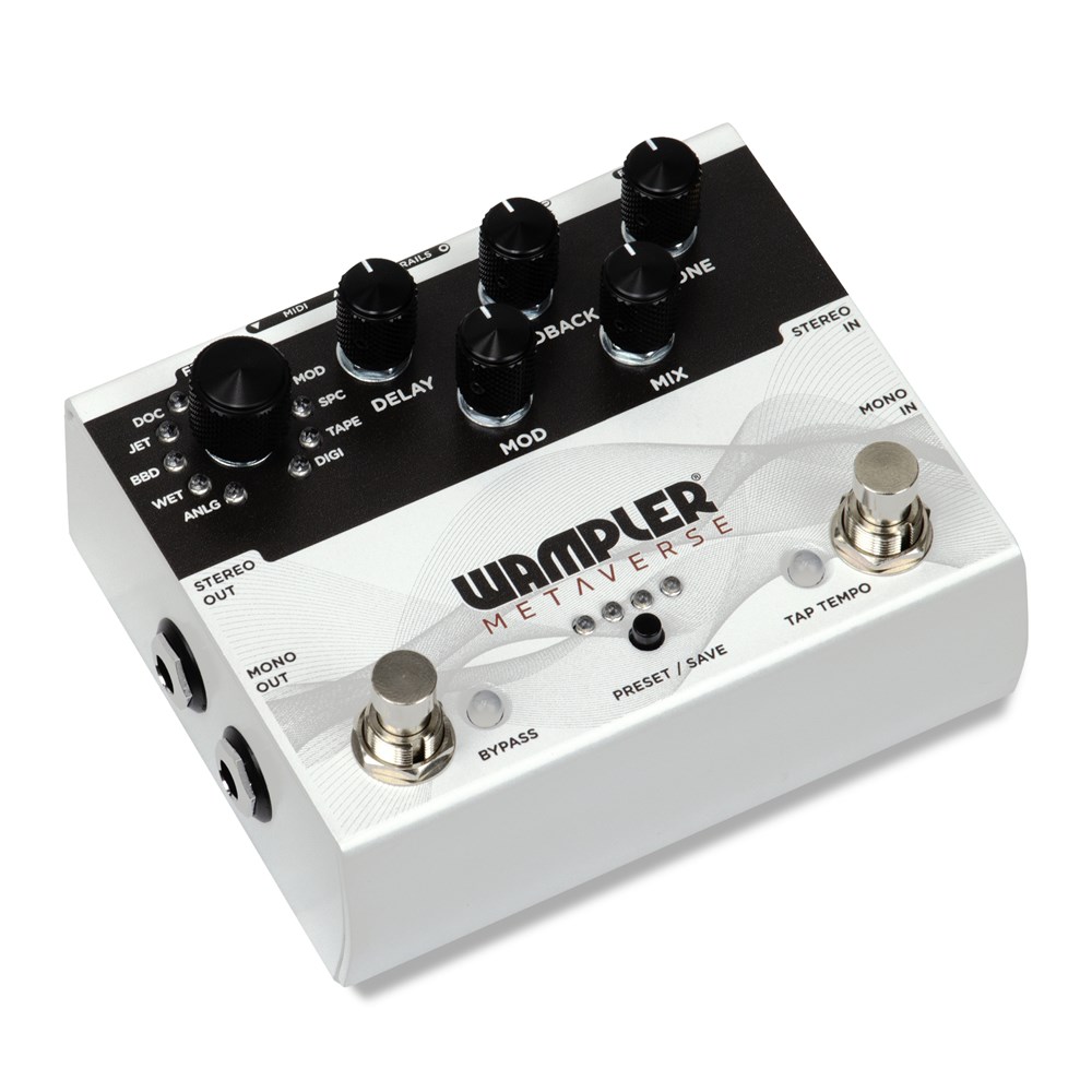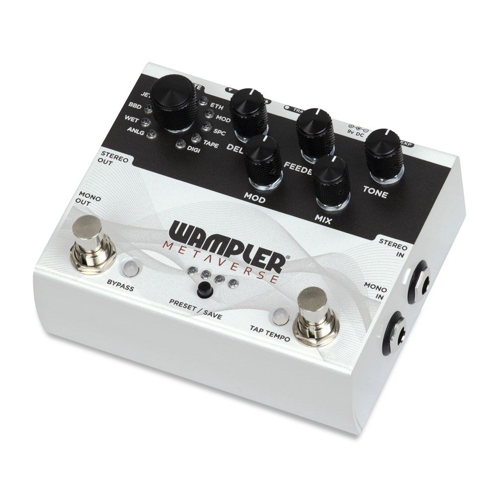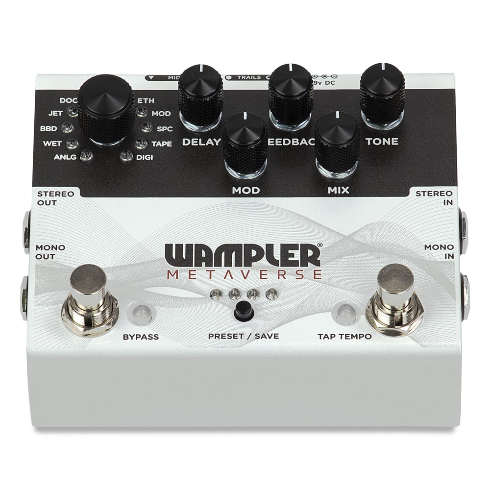The Wampler Metaverse is a powerful studio and stage ready DSP multi-delay pedal with an advanced MIDI command set. Comprising eleven of Brian Wampler’s favorite delays, the Metaverse is a full-featured, small-footprint stomp box that is fully programmable, preset capable, has stereo inputs and outputs, allows full MIDI control, and has an expression input that you can assign to ANY of the parameters.