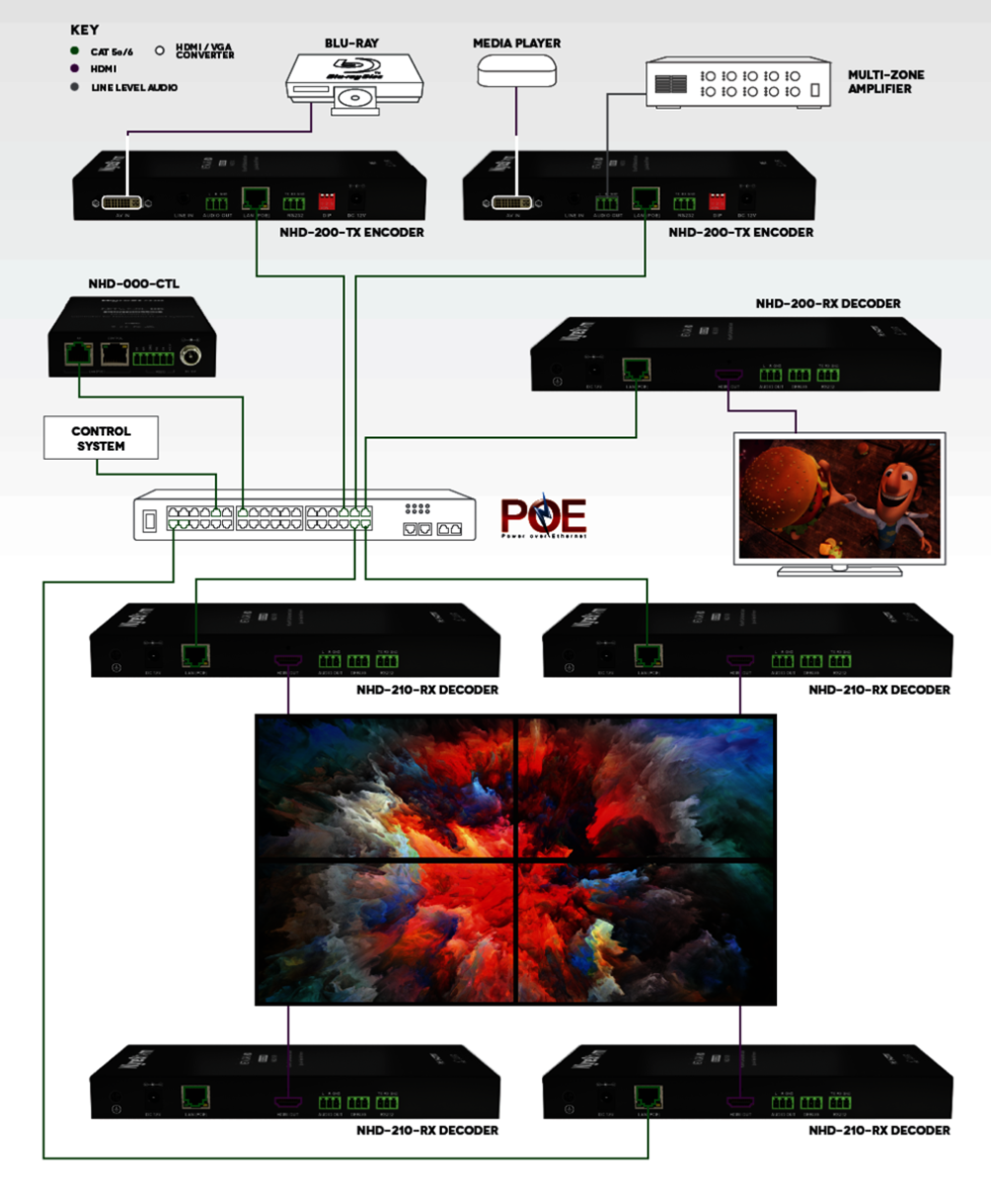 VIDEO WALLSThe NHD-210-RX decoder offers matrix switching and video wall functionality up to 10x10 when paired with an NHD-200-TX encoder for multi-format input transmissions of DVI, HDMI, Component and VGA including HDMI and analog audio breakout.