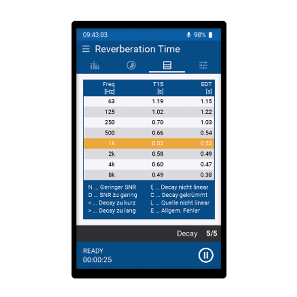 1/3-octave band: 50 Hz - 10 kHzEarly Decay Time EDT, T15T30, T20, T15, EDT simultaneouslyMinimum trigger levelAudio RecordingRoom AverageDecay curve (planned)