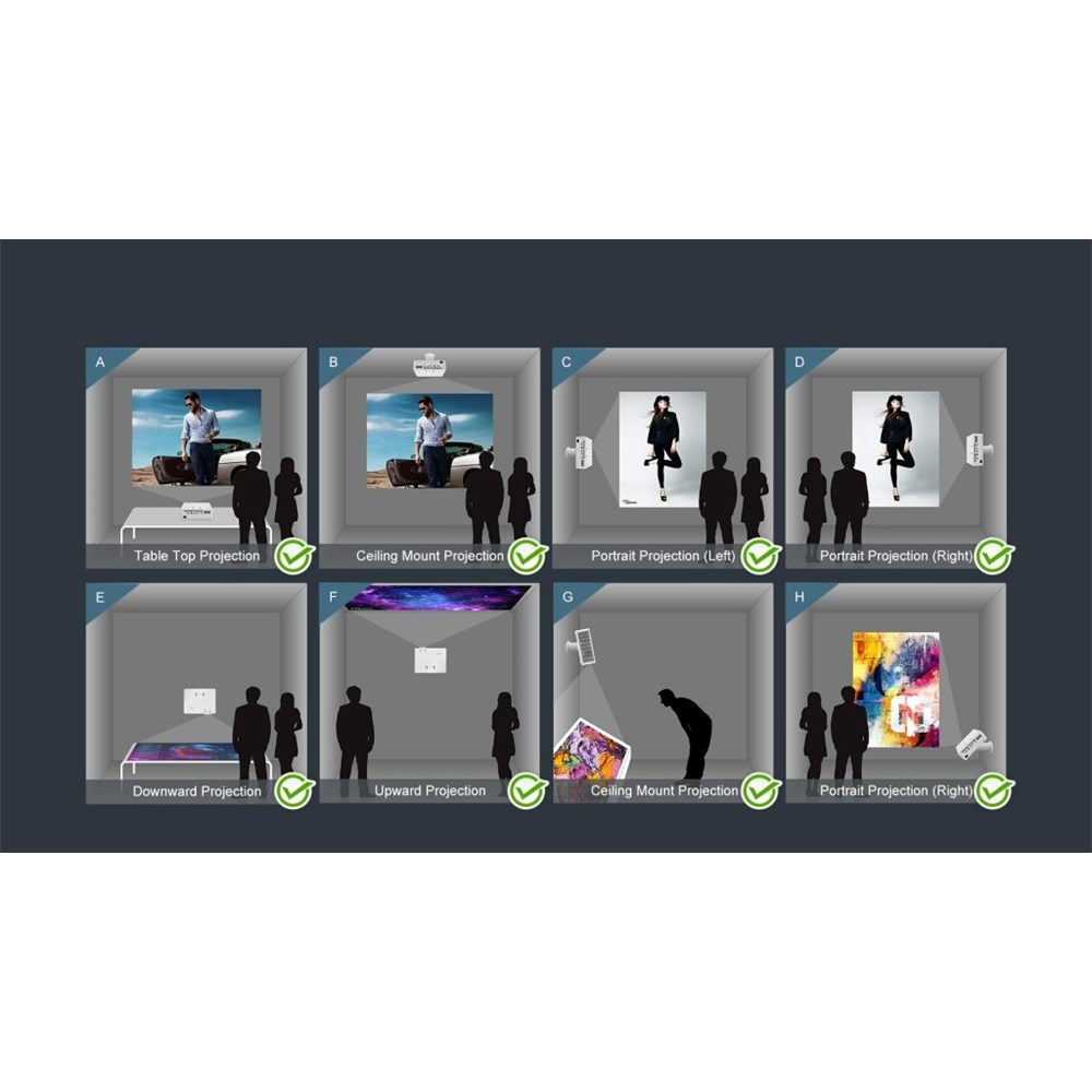 Images can be projected over a full 360° range along the vertical axis, including reproduction on a ceiling or floor. ZH507 can also be placed in portrait mode for applications such as digital signage or for tall thin projection areas.