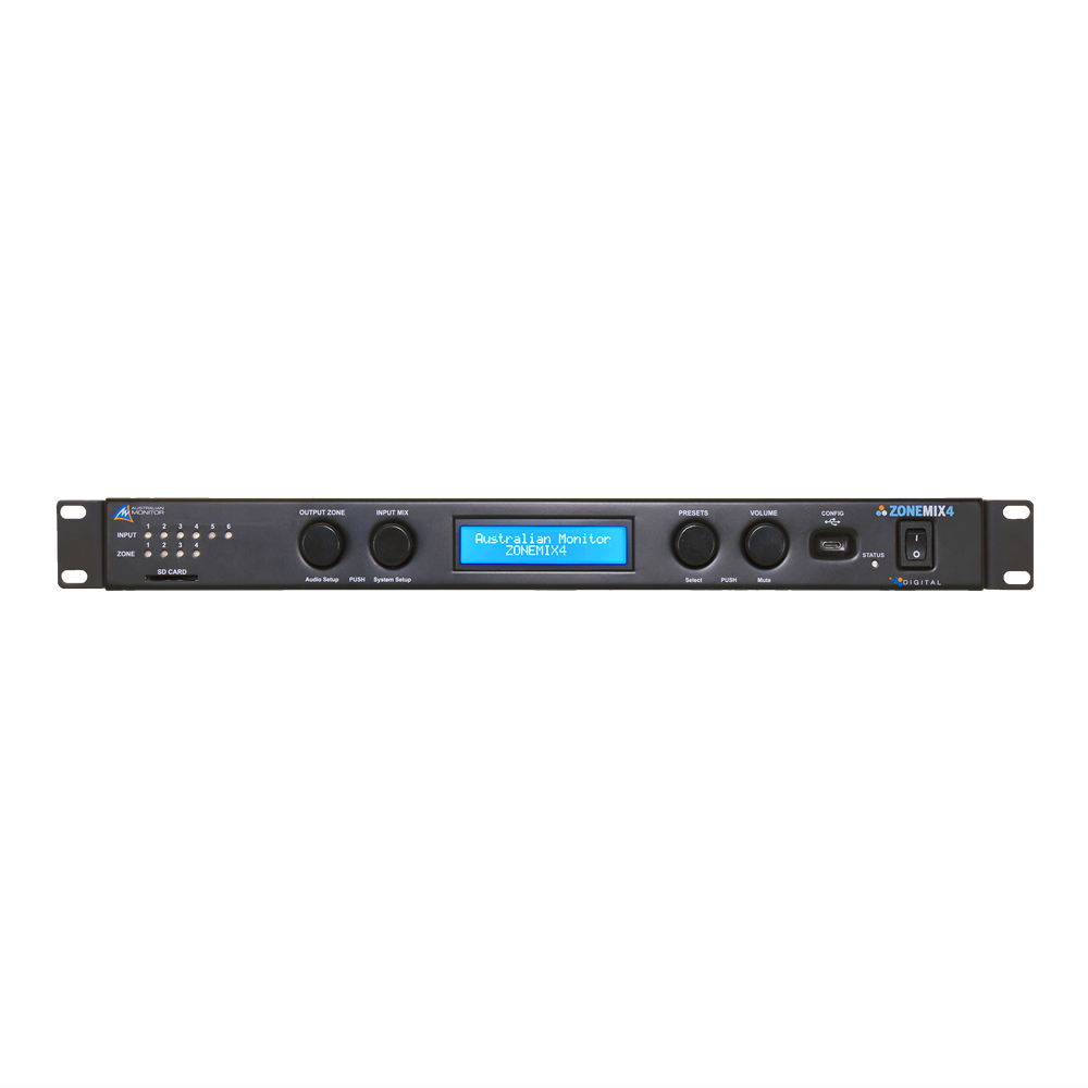 The ZONEMIX4 provides a 4 zone mixing and paging solution featuring USB, Ethernet and RS232 connectivity.  Optional wall panel accessories include 3 controller models, a Bluetooth receiver, and a mic/line level input.  A PC application allows for setup and control of the ZONEMIX and customisation of the wall panels and paging stations.